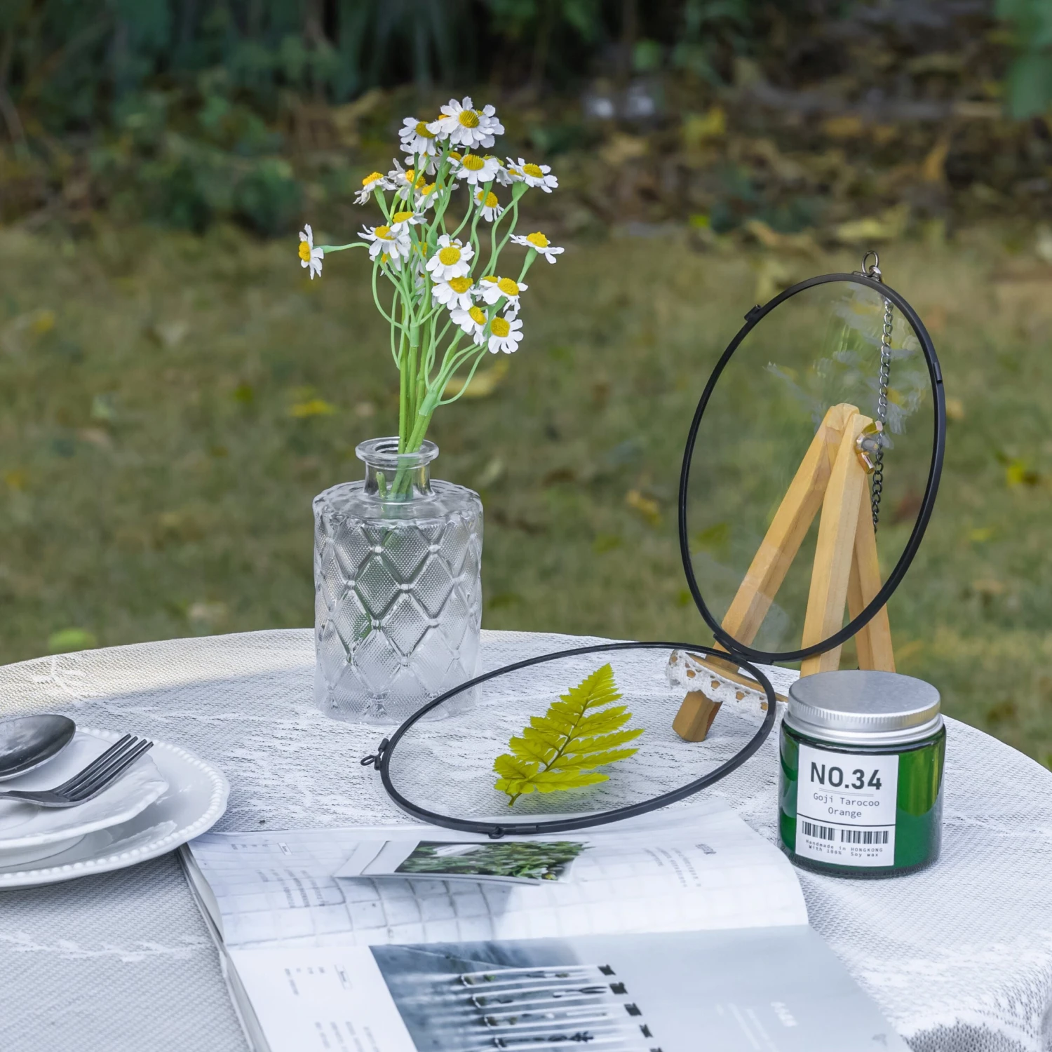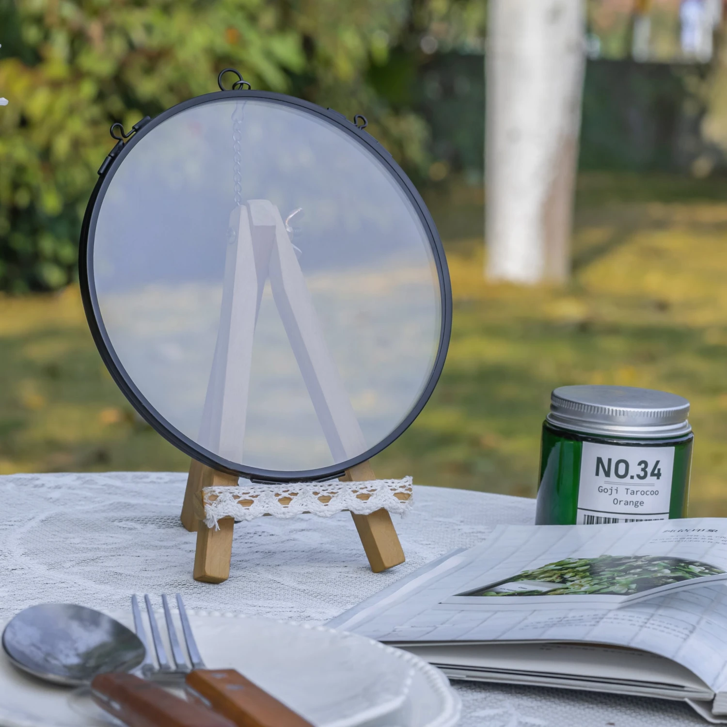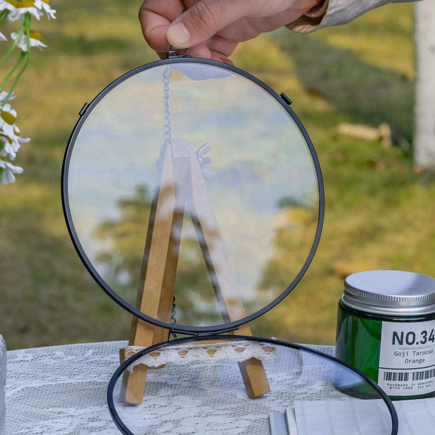 3. Handmade round double glass brass and glass frame with black color, go well with pressed flowers and plants.
