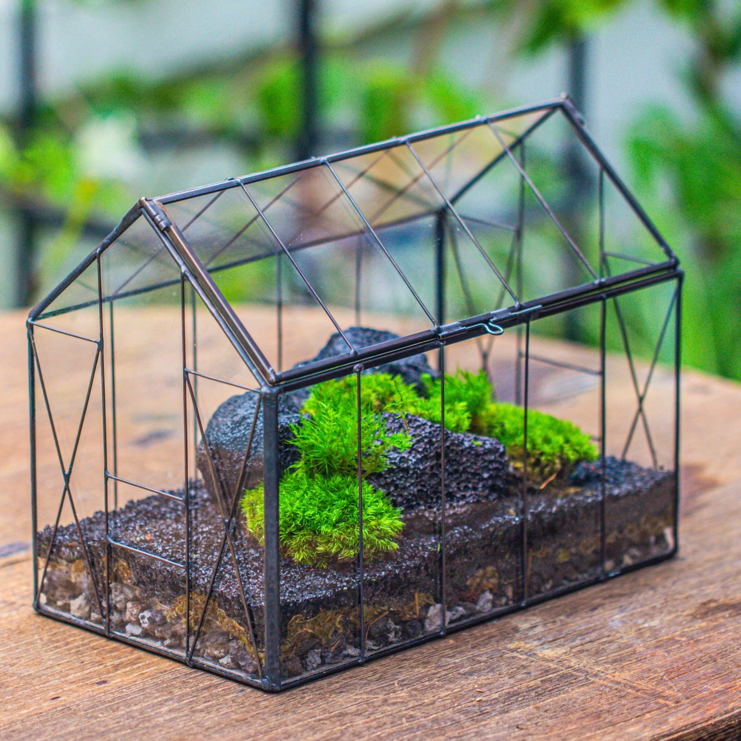 1. This is a vintage-style house-shaped geometric terrarium with a swing lid inspired by a vintage old glass greenhouse.