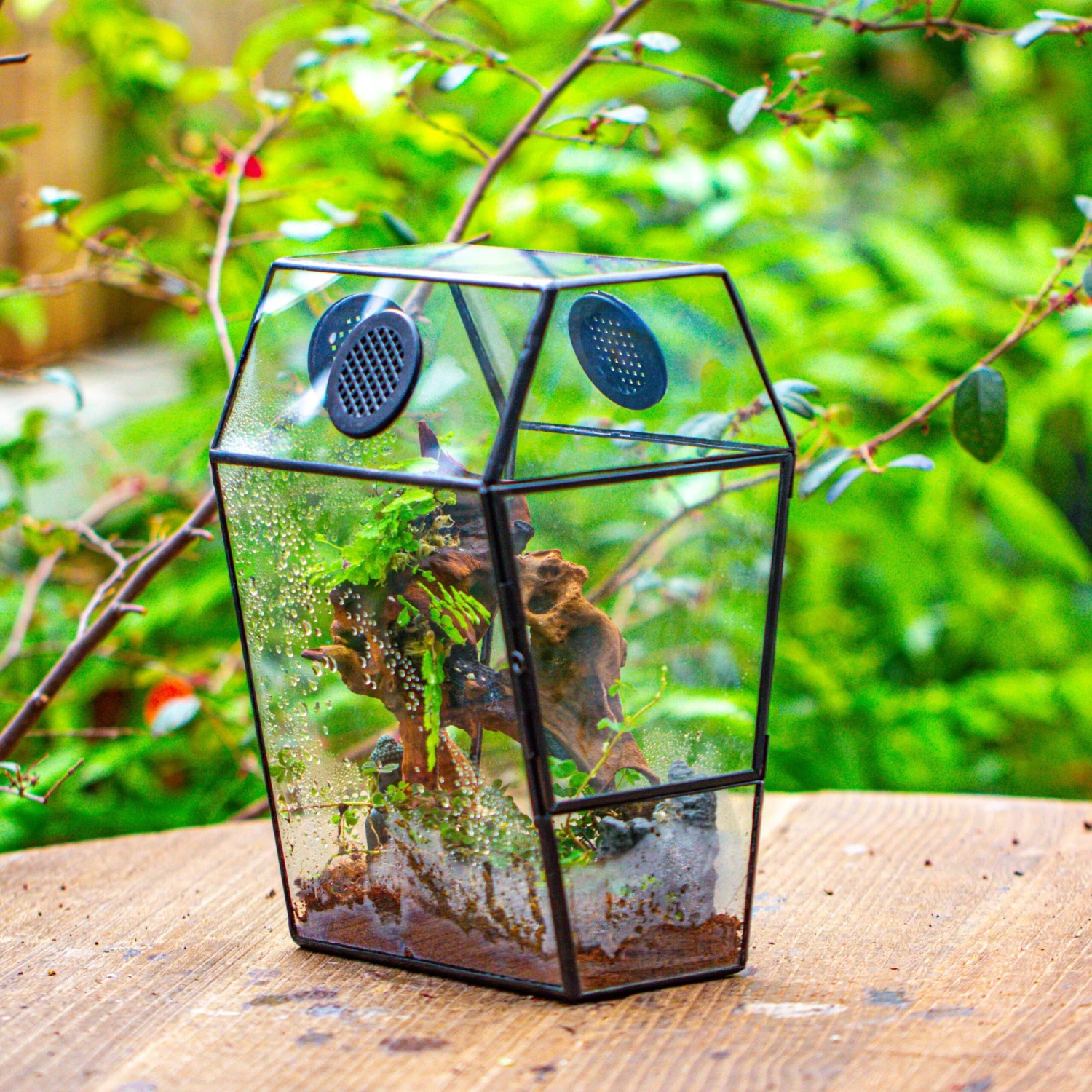 - The terrarium is made of glass and tin, with a front door (slide latch) with 3 removable black plastic vents. Please note that the vent holes are about 1-2 mm. There are gaps around the door 1-3mm for hand soldering. Thus, it is not suitable for smal spiders. Please check the size of the insects before purchasing.