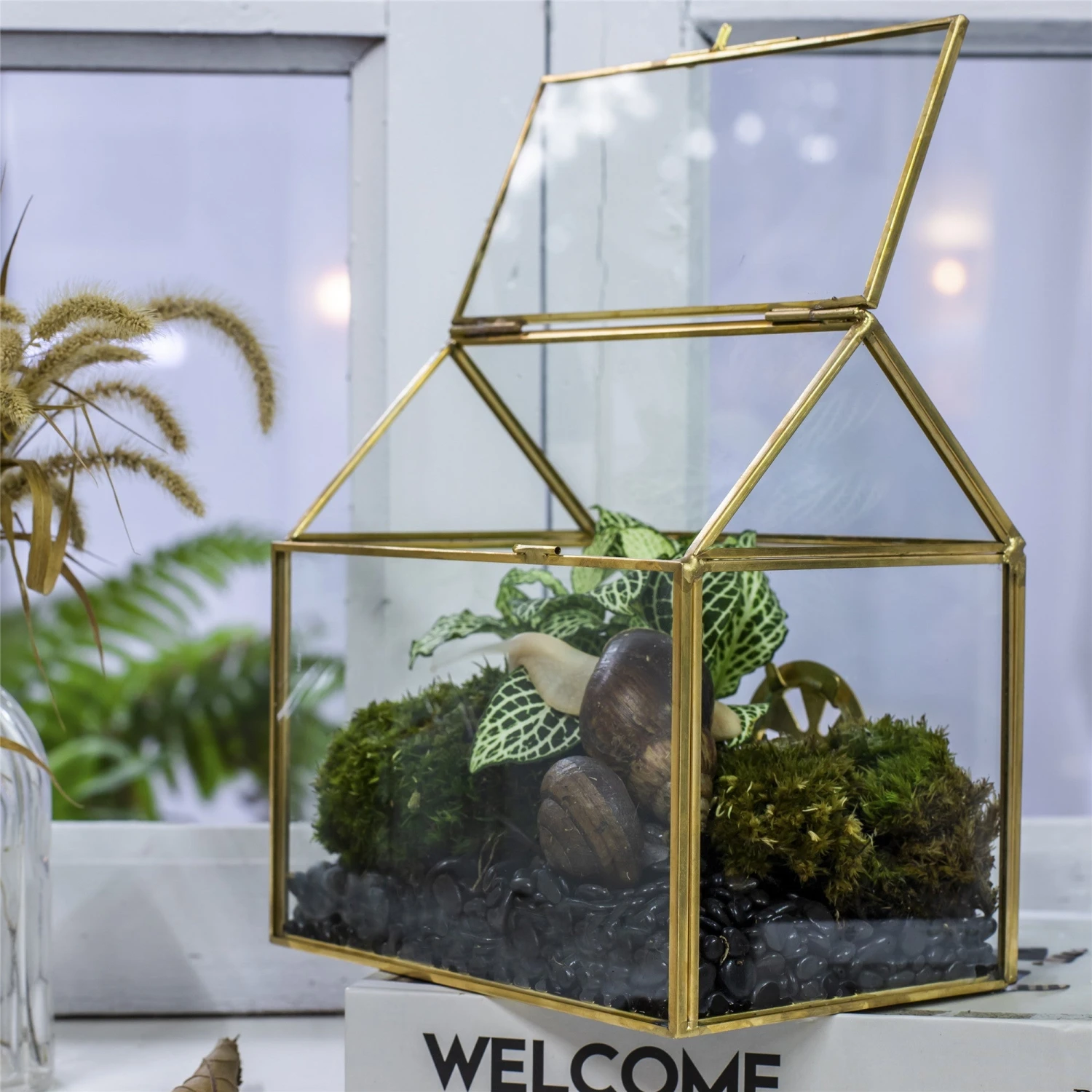 Be the first to review “Handmade NCYP Geometric Glass Gold Terrarium Box House Shape, Close, Tabletop, Swing Lid For Air Plants Moss Snail Reptile Habitat” Cancel reply
