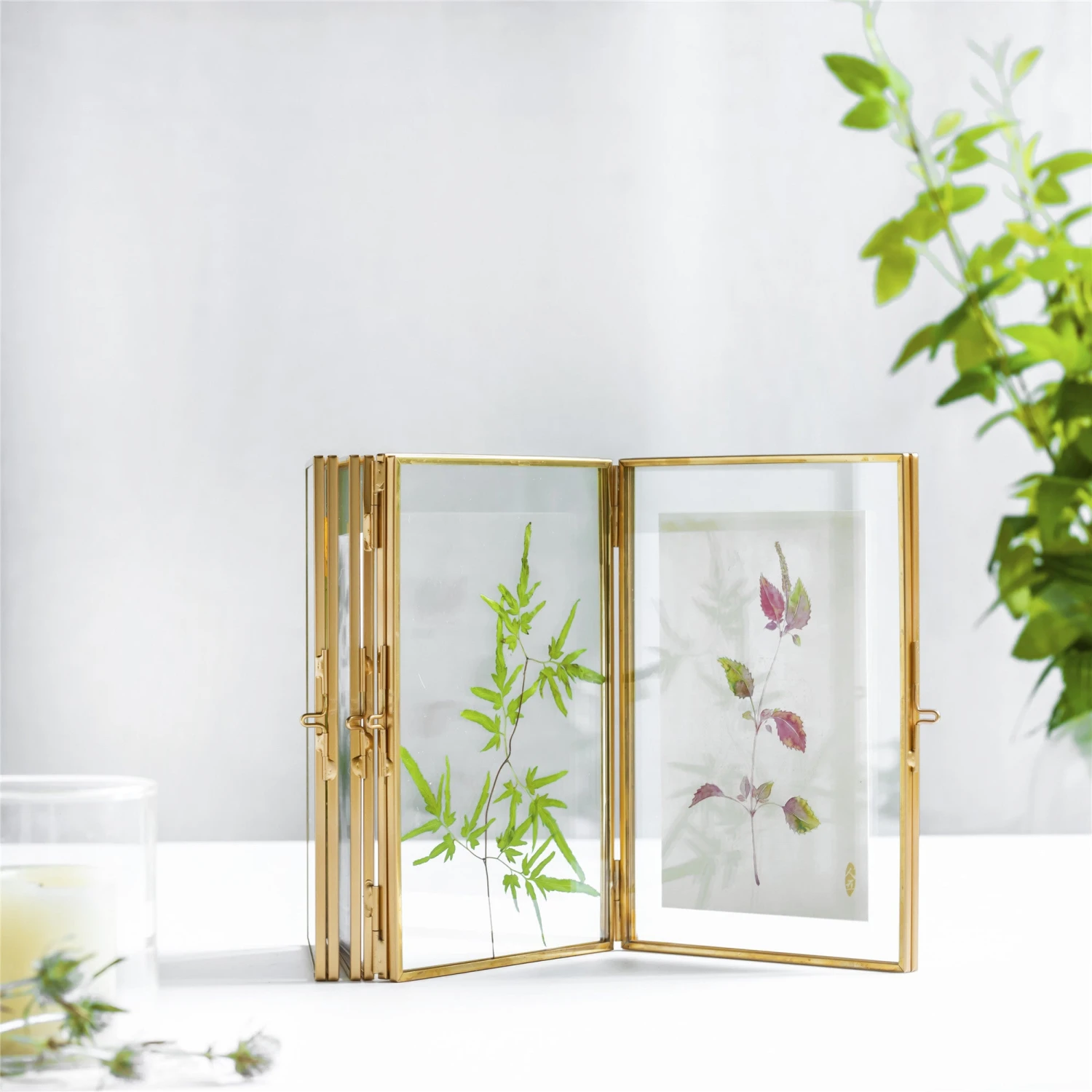 Inspired by an Asian folding screen, we make this unique frame to display preserved plants, your favorite quotes, letters, portraits, etc. It can stand itself on the table, showing a series of photos.