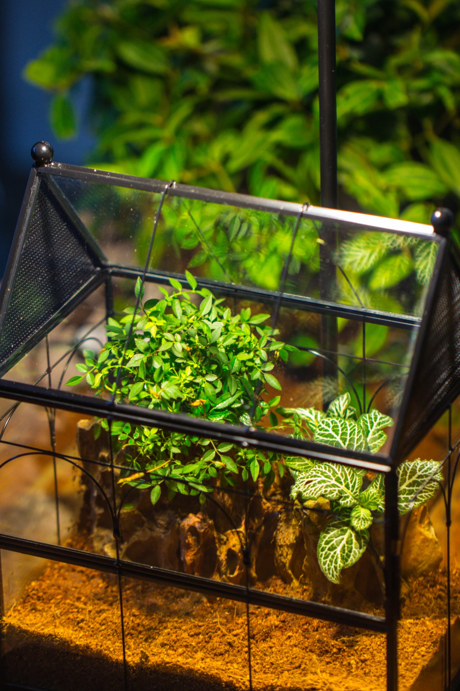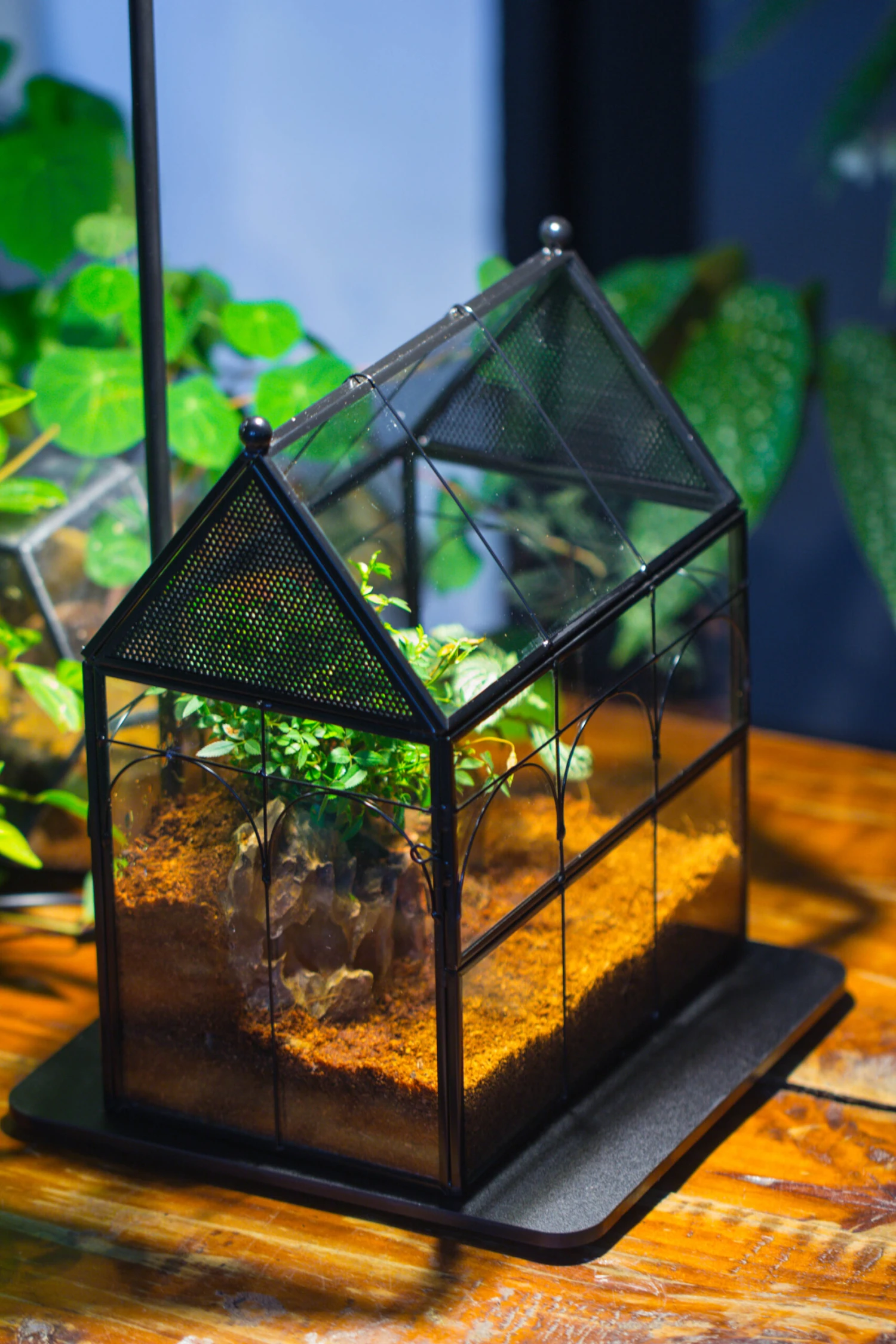 A terrarium and an LED plant grow light with a wooden base. The LED light is white. All other plants and decorations are not included. We designed this greenhouse set with great effort and precision. We will ship out the terrarium and the light set separately if we have stock in a different warehouse. You might receive 2 packages in total. Welcome to message me if you have any questions about this set.