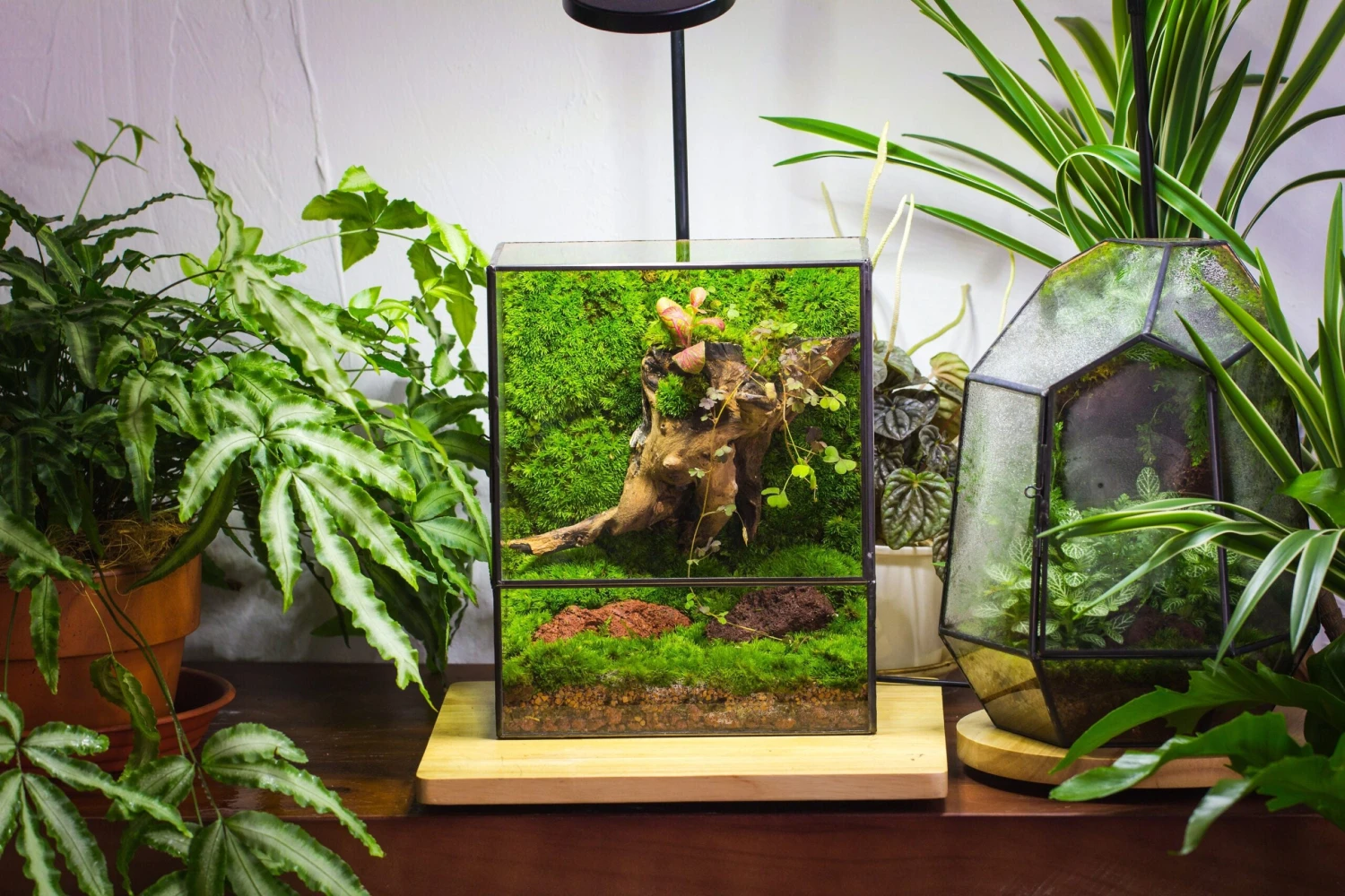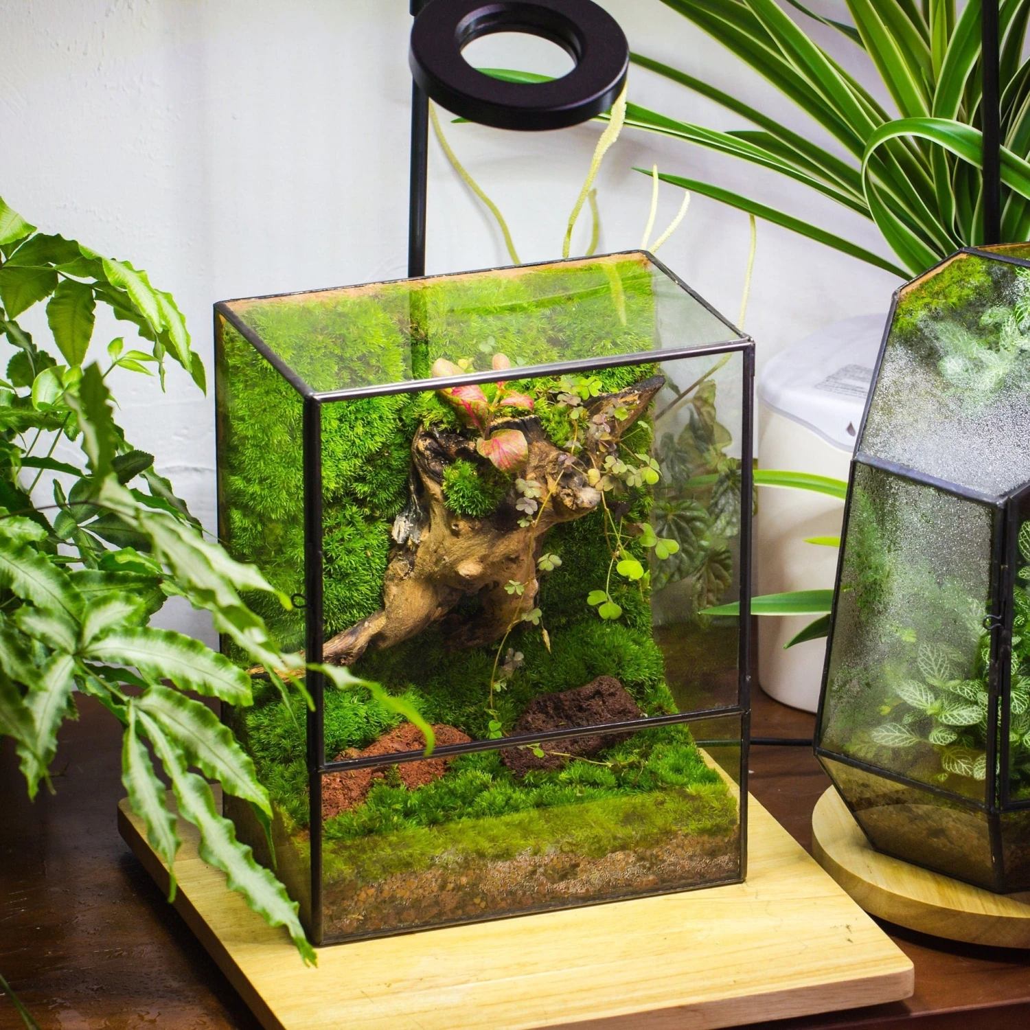 1. Close geometric terrarium, rectangle shape, with a side door to keep moisture.