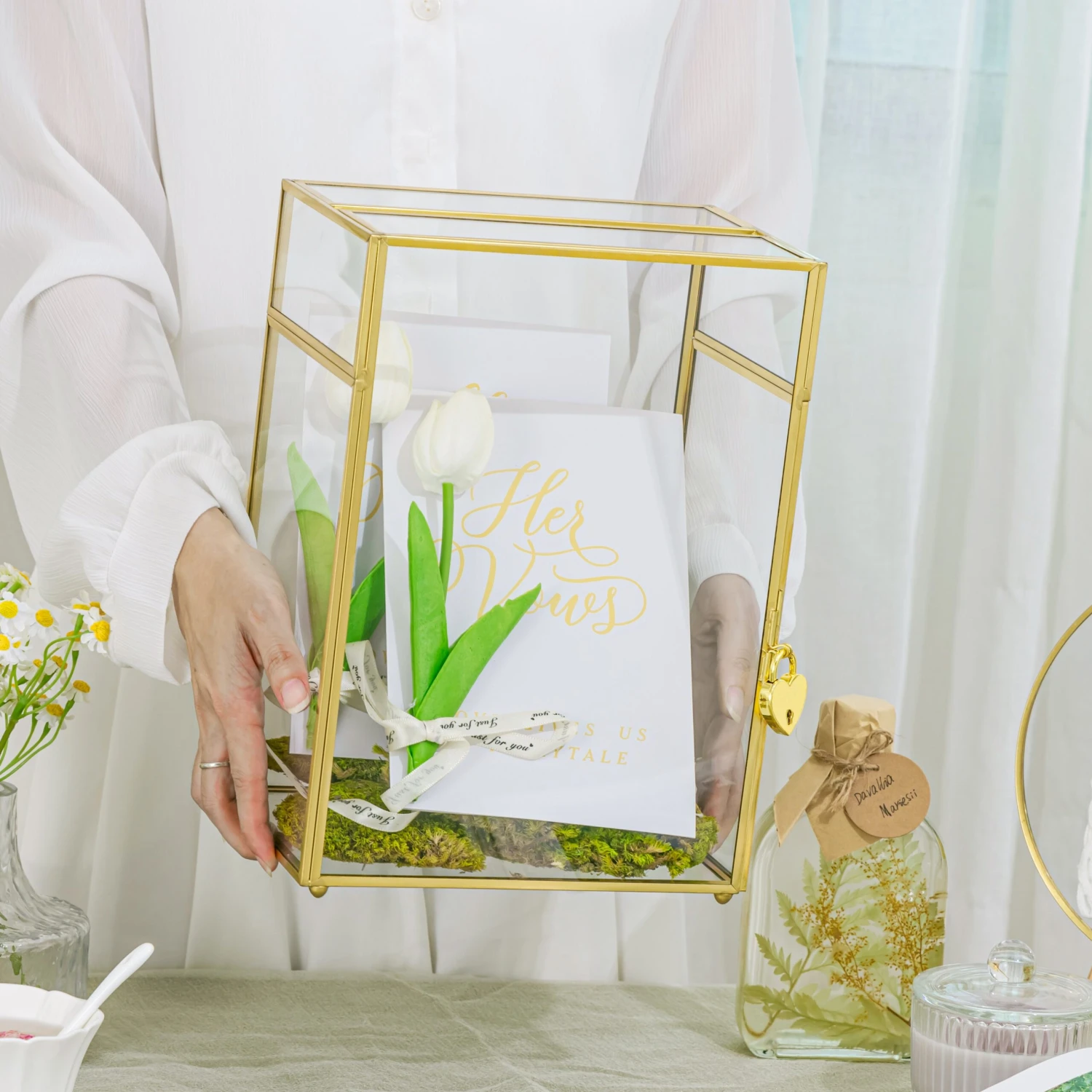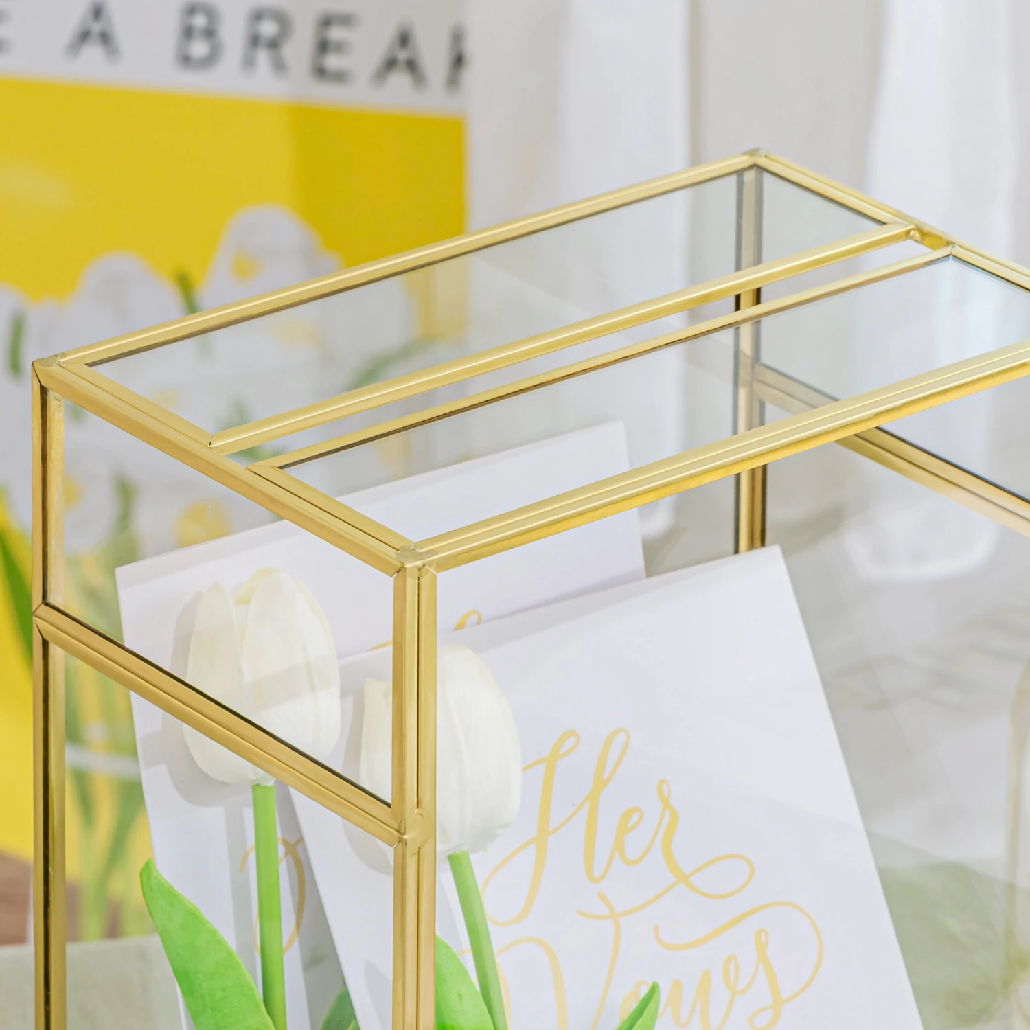 - The gold rectangle-shaped glass card box, with slot and lock, is great for a centerpiece and display case. It is also ideal for a glass card holder for a wedding or birthday party card collection on a reception table.